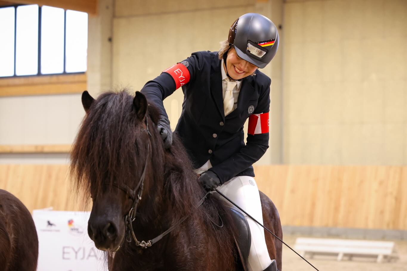 Zuerst hatte Super-Kjarkur, mit dem Elfa auf der DJIM 2022 Viergang, Tölt und Dressur gewonnen hatte, kurz nach dem Ankommen auf der DJIM eine Kolik, so dass sie mit ihm aufgrund der Medikamentengabe nicht mehr starten durfte 😞